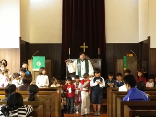 ○礼拝の後、学年別に「分級」が30分程あり、楽しい活動をしています(「成人科」相当の「聖書を学ぶ会」が分級と並行して行われています。求道者・保護者の方々にお薦めいたします)。