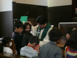礼拝の出席者が100名を越え、満堂の会衆のただ中で、牧師の按手と共に、集う子どもたち全員に祝福が祈られました。